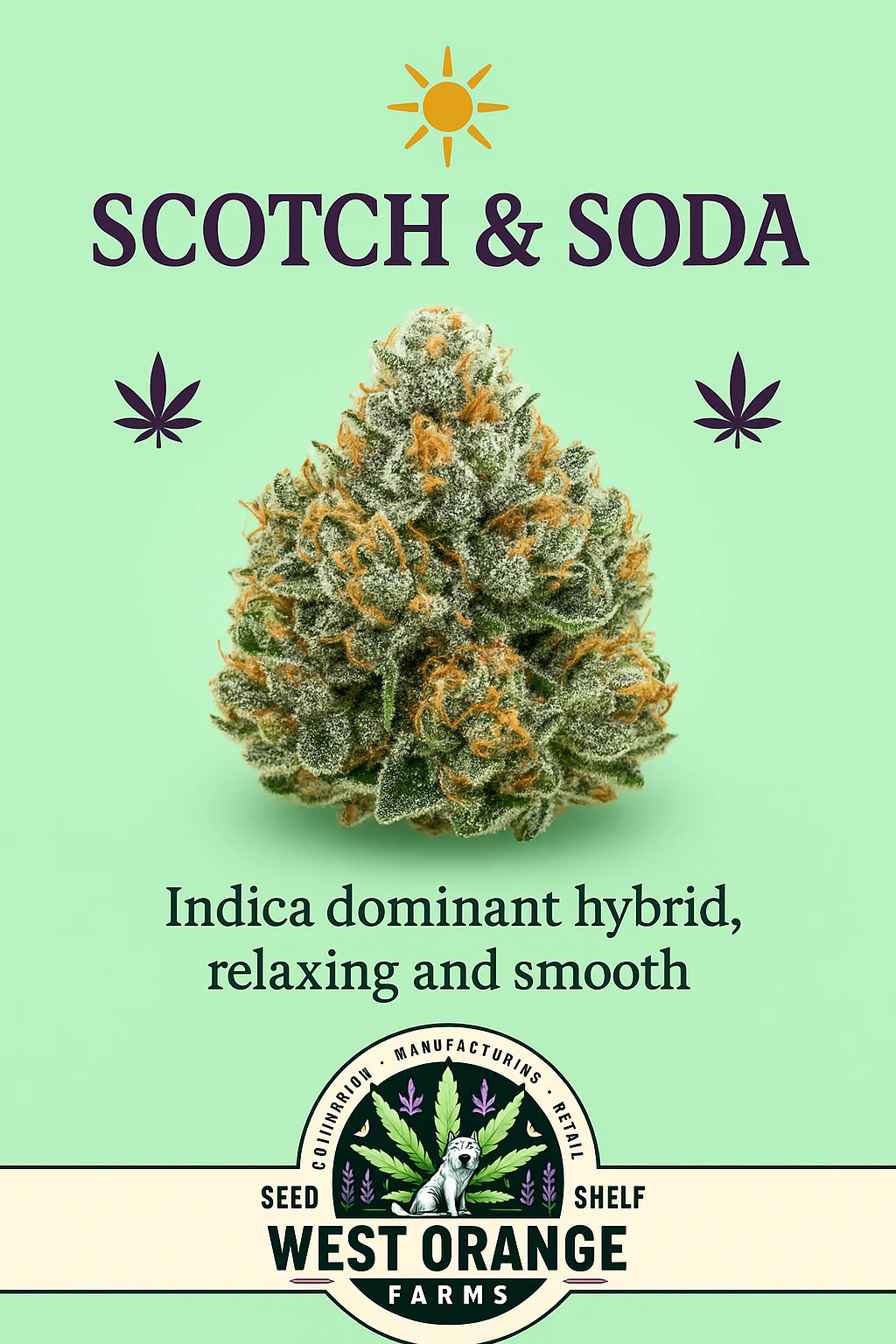 Scotch & Soda is a hybrid cannabis strain, developed by Galaxy Labs, known for its calming and relaxing effects that encourage rest and stillness. It has a sweet, earthy flavor profile with notes of creamy banana, vanilla, and subtle spice. Created by crossing Banana Punch GMO #2 with LilMissHS, the strain can produce a slow-building body high and a mellow mental shift.