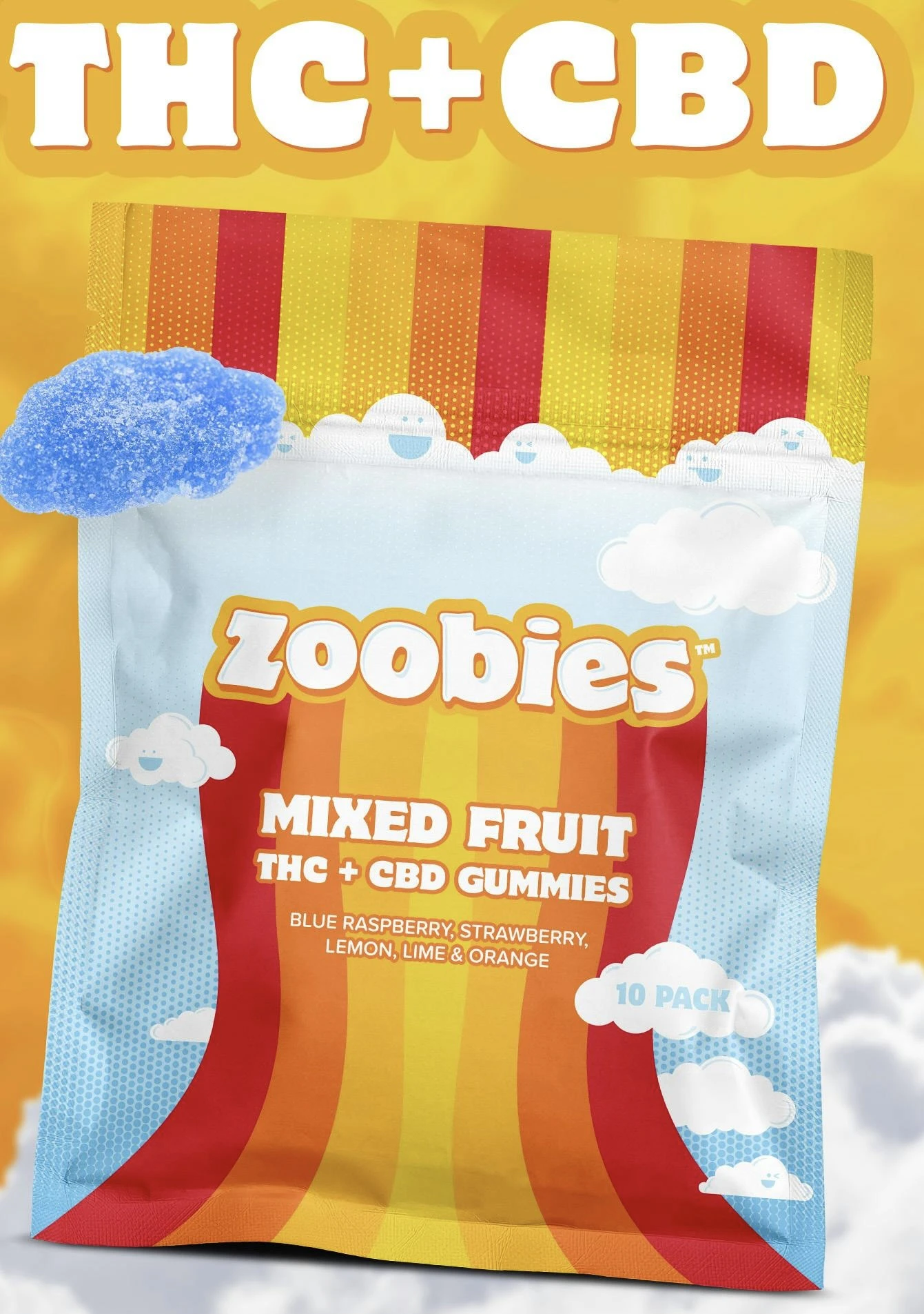 Zoobies Mixed Fruit 1:1 hybrid gummies are flavored, cannabis-infused soft chews designed for a balanced, relaxing experience, featuring 100mg THC and 100mg CBD total (10mg each per gummy) in a 10-pack. These edibles provide a mix of fruity flavors (strawberry, blue raspberry, lemon, lime, orange) and are designed to offer a blend of light euphoria and body relaxation, suitable for both beginners and experienced users.